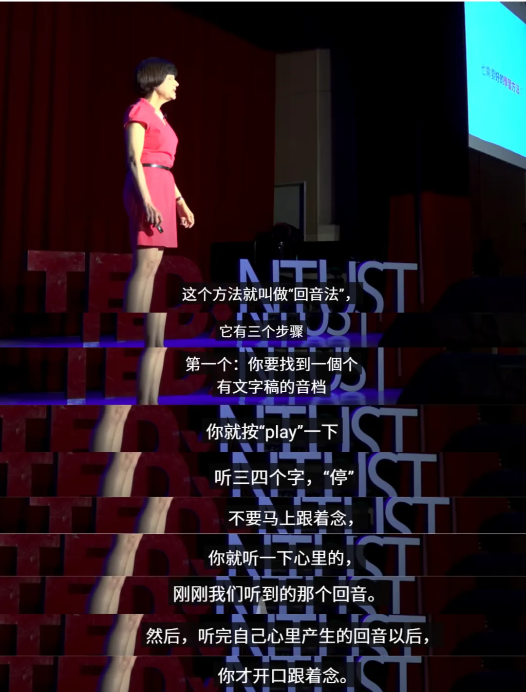 echo: 暂停播放,耳边留有一个和原音一模一样的声音,即「回音」,仔细听回音,并在心里重复一遍。