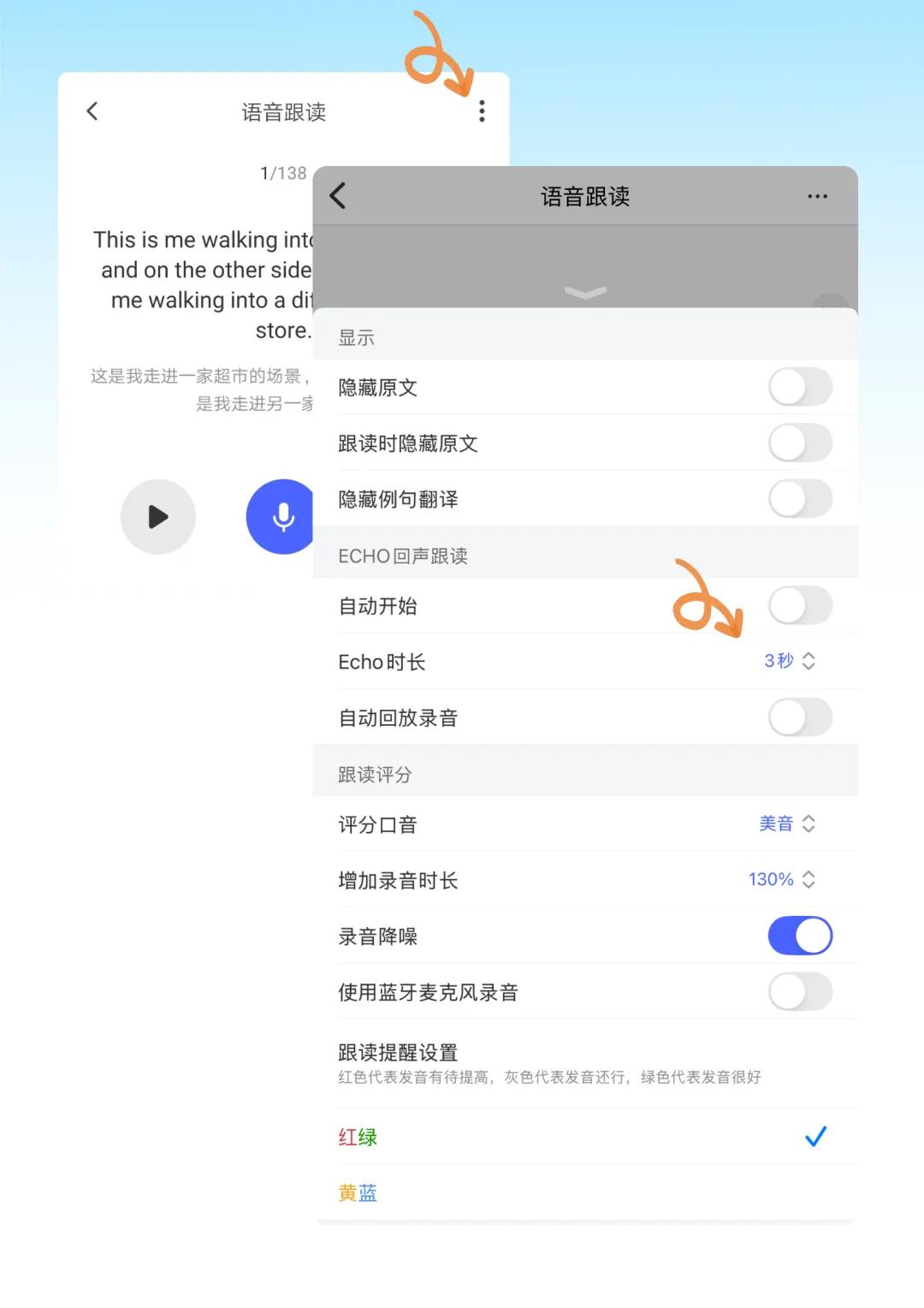 点击页面右上角的三个点,可以设置是否自动开始、Echo时长及是否自动回放录音。