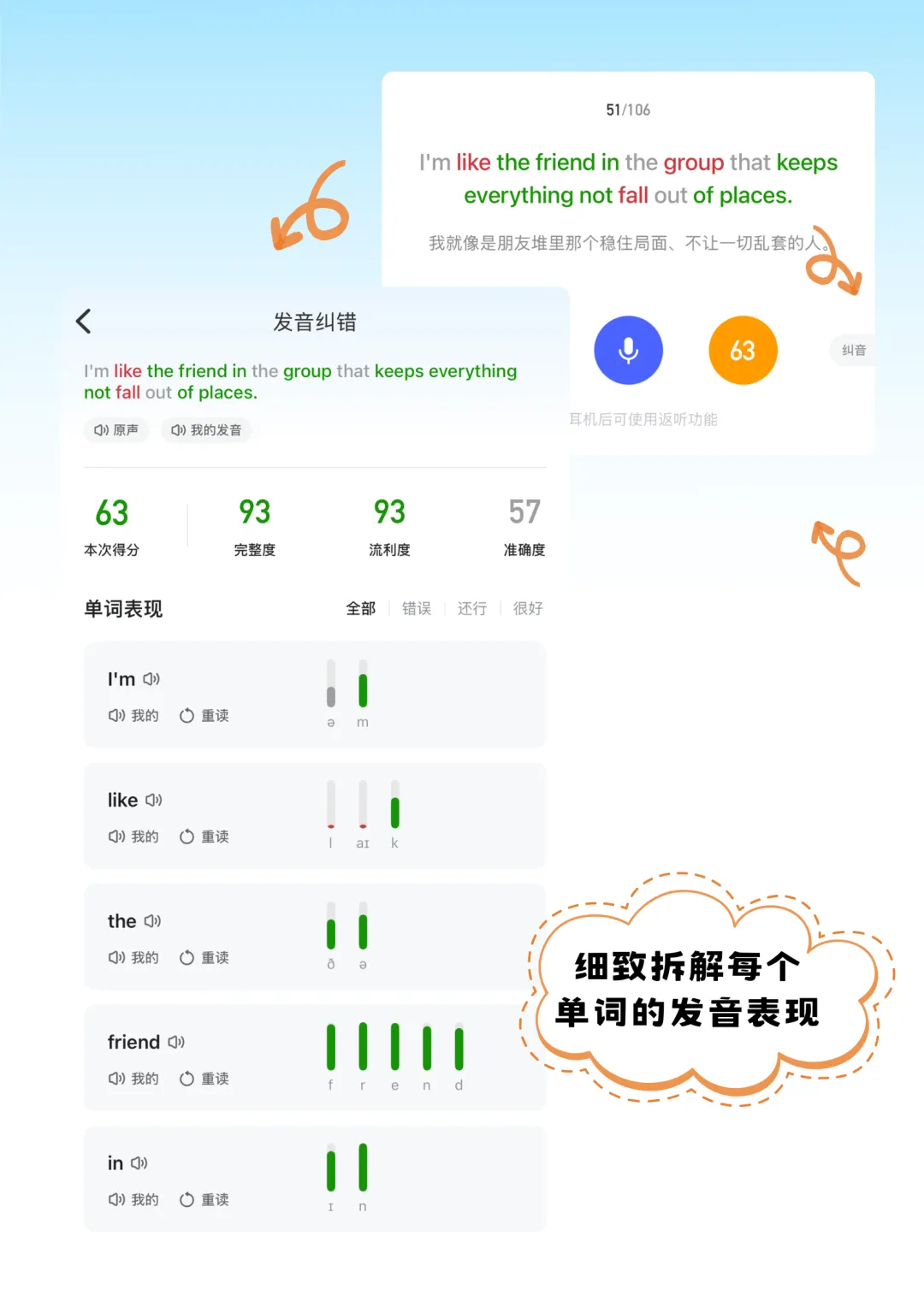 系统还会为你按照单词音标细致拆解每个音的发音表现,让每个音都成为可优化的发音单元。对于存在问题的单词,可以随时播放单词原声进行录音跟读,直到彻底攻克发音难点。