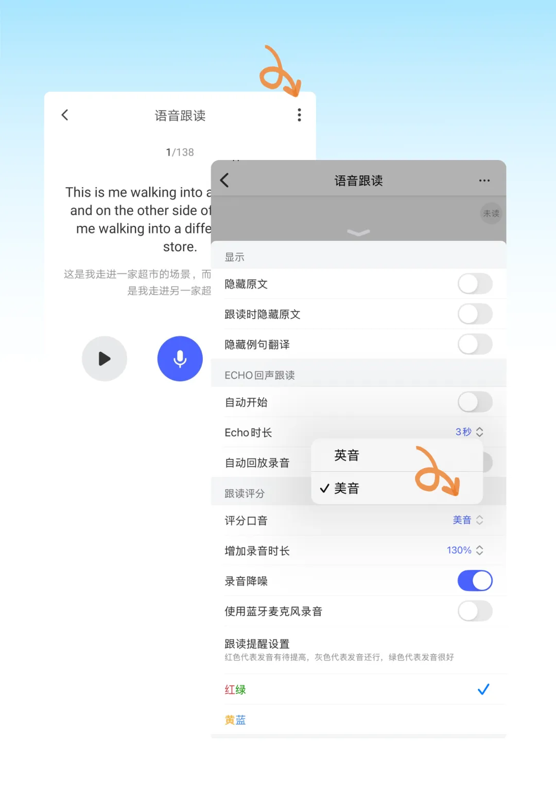 评分口音支持英音和美音,无论是活泼的美式发音,还是优雅的伦敦腔,只需一键选择,就能匹配你想练习的口音类型,告别 “混搭风” 的烦恼~