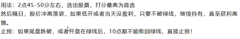 指标在电脑上用,交易日9:25后-9:30之前,快捷键 .401 更改排序指标为“神力多因排”,数值由高到低,取第1只,如第1只为一字板或开盘太高,则顺下一只,手机调节好参数,进行选股,然后幅图对比数值。