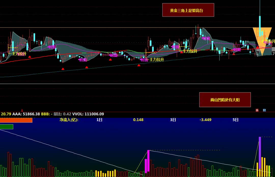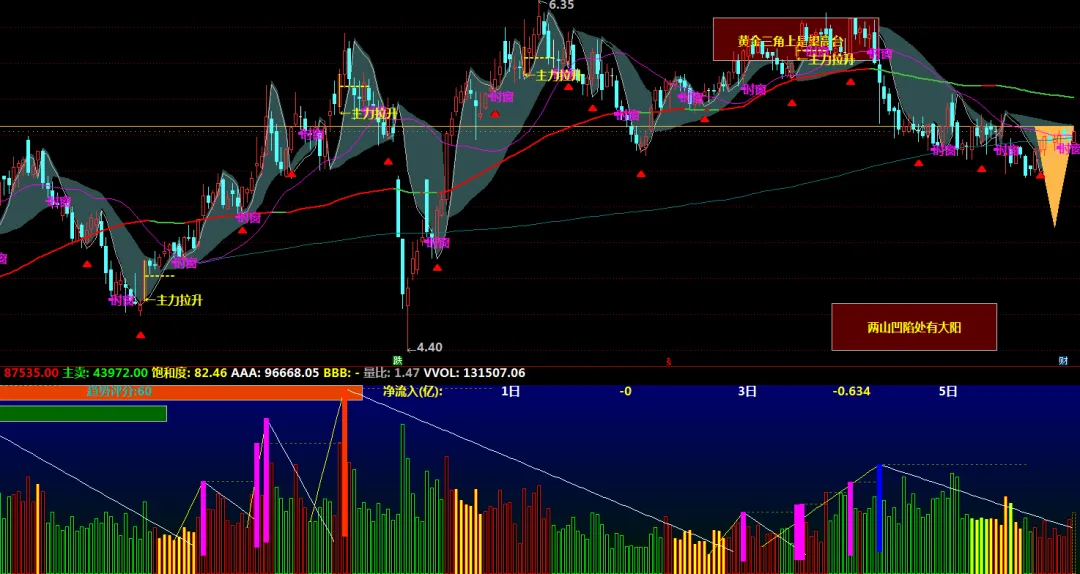 新SAR100:=NEWSAR(1,100);新SAR10:=NEWSAR(1,10);新SAR5:=NEWSAR(1,5);新SAR1:=NEWSAR(1,1);DRAWBAND(新SAR10,RGB(47,79,79),新SAR100+0.02,RGB(47,79,79));前20内高:=HHV(C,20);昨前高:CONST(REF(前20内高,2)),COLOR49B9FD;支撑线:=DRAWLINE(CURRBARSCOUNT=5,昨前高*0.9,CURRBARSCOUNT=1,昨前高,0);DRAWBAND(昨前高,RGB(253,185,73),支撑线,RGB(0,0,0));支撑线2:=DRAWLINE(CURRBARSCOUNT=9,昨前高,CURRBARSCOUNT=5,昨前高*0.9,0);DRAWBAND(昨前高,RGB(253,185,73),支撑线2,RGB(0,0,0));新SAR基准:NEWSAR(1,100),COLORLIGRAY;DRAWRECTREL(780,850,920,980,90);DRAWTEXT_FIX(1,0.81,0.9,0,'两山凹陷处有大阳'),COLORYELLOW;DRAWRECTREL(680,50,820,170,90);DRAWTEXT_FIX(1,0.70,0.10,0,'黄金三角上是望高台'),COLORYELLOW;DRAWKLINE(HIGH,OPEN,LOW,CLOSE);反转信号:新SAR基准<REF(新SAR基准,1)&&REF(新SAR基准,1)<REF(新SAR基准,2)&&REF(新SAR基准,2)<REF(新SAR基准,3)&&C>新SAR基准,NODRAW,COLORRED;DRAWICON(反转信号,L*0.985,38);M72:MA(C,72),COLORLIGREEN,LINETHICK2;IF(M72>REF(M72,1),M72,DRAWNULL),COLORRED,LINETHICK2;M240:MA(C,240),COLORLICYAN;MSAR24:MA(新SAR基准,24),COLORMAGENTA;K线数量:=BARSCOUNT(C);年内最高:=HHV(H,200);年内最低:=LLV(L,200);单位幅度:=(年内最高-年内最低)/150;基准线:=年内最低-单位幅度;STICKLINE((K线数量+0)/13=FLOOR((K线数量+0)/13),基准线,基准线-单位幅度,4,0),COLORF00FF0;DRAWTEXT((K线数量+0)/13=FLOOR((K线数量+0)/13),基准线-单位幅度,'时窗'),COLORF00FF0;均价:=AMOUNT/V;破均价:=L<均价*0.9;涨幅大:=(C-REF(C,1))/REF(C,1)*100>1.2;破五日均:=L<MA(C,5)*0.921;缩量:=V<MA(V,5)*1.5;老鼠仓信号:=破均价&&涨幅大&&破五日均&&缩量;DRAWTEXT(老鼠仓信号,LOW*0.985,'△老鼠仓'),COLOR40CCFF;均价2:=(2*C+H+L+O)/5;加权均价:=(8*均价2+7*REF(均价2,1)+6*REF(均价2,2)+5*REF(均价2,3)+4*REF(均价2,4)+3*REF(均价2,5)+2*REF(均价2,6)+REF(均价2,8))/36;放量条件:=VOL=HHV(VOL,10)&&VOL>2*REF(VOL,1)&&CLOSE>加权均价&&C>REF(C,1);主力拉升:=FILTER(放量条件,5);STICKLINE(主力拉升,OPEN,CLOSE,0,1),COLORYELLOW;DRAWTEXT(主力拉升,L,'←主力拉升'),COLORYELLOW;DRAWTEXT(主力拉升,O+(C-O)*0.618,'------'),COLORYELLOW;CONST(C),POINTDOT,COLORLIGRAY;DRAWTEXT_FIX(1,0.00,0.14,0,DYBLOCK),COLORYELLOW,LINETHICK2;DRAWTEXT_FIX(1,0.00,0.00,0,'主题投资:'),COLORRED;DRAWTEXT_FIX(1,0.075,0.00,0,EXTERNSTR(0,1)),COLORLIMAGENTA;DRAWTEXT_FIX(1,0.00,0.08,0,'主营业务:'),COLORFF00FF;DRAWTEXT_FIX(1,0.075,0.08,0,EXTERNSTR(0,2)),COLORFF00FF;DRAWTEXT_FIX(1,0.06,0.14,0,EXTERNSTR(0,3)),COLORLIGRAY;DRAWTEXT_FIX(1,0.01,0.20,0,EXTERNSTR(0,4))COLORCYAN;