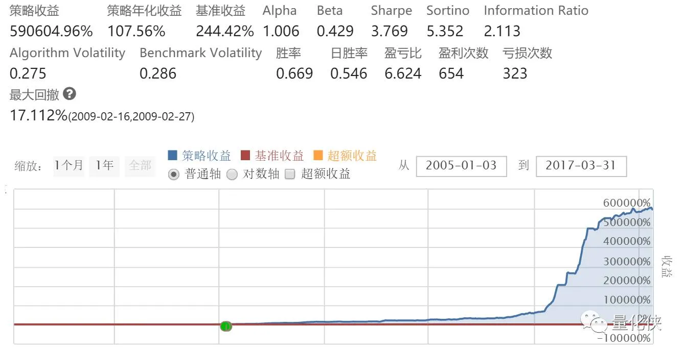 下图是回测全A股市场从2005年到2017年的回测绩效图,12年收益5906倍。如果12年前投入10万元本金连续12年的年化收益107%。现在你有将近6个亿,这不是梦。