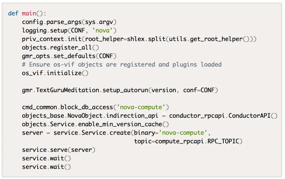 数了下目前最新的Nova大概有22个main函数入口,由此可知Nova项目安装后会包含22个可执行程序,其中nova-compute服务的入口函数为nova/cmd/compute.py(. -> /)模块的main函数: