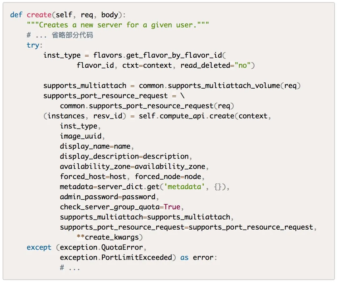 根据前面的理论,创建虚拟机的入口为nova/api/openstack/compute/servers.py的create方法,该方法检查了一堆参数以及policy后,调用compute_api的create()方法。