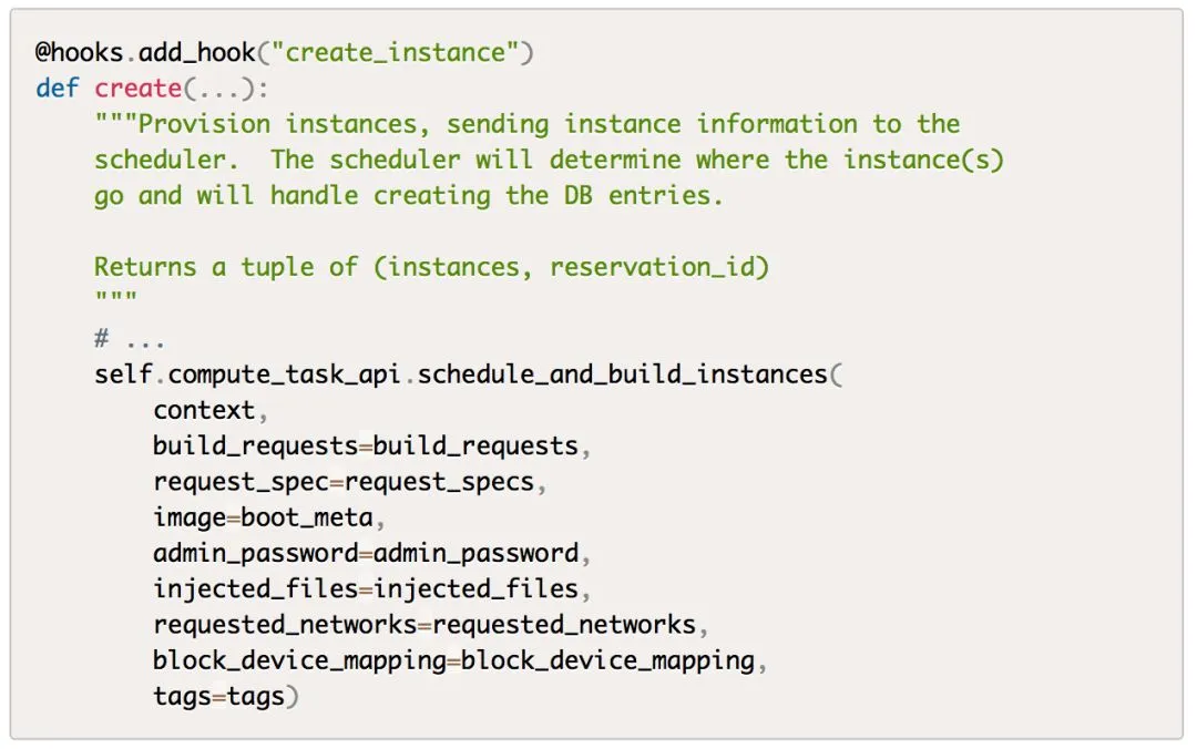 这里的compute_api即前面说的nova/compute/api.py模块,找到该模块的create方法,该方法会创建数据库记录、检查参数等,然后调用compute_task_api的schedule_and_build_instances方法: