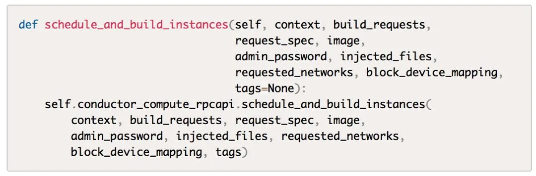 由于是向nova-conductor发起的RPC调用,而前面说了接收端肯定是manager.py,因此进程跳到nova-conductor服务,入口为nova/conductor/manager.py的schedule_and_build_instances方法。