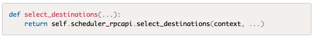 scheduler_client和compute_api以及compute_task_api都是一样对服务的client封装调用,不过scheduler没有api.py模块,而是有个单独的client目录,实现在nova/scheduler/client目录的query.py模块,select_destinations方法又很直接的调用了scheduler_rpcapi的select_destinations方法,终于又到了RPC调用环节。
