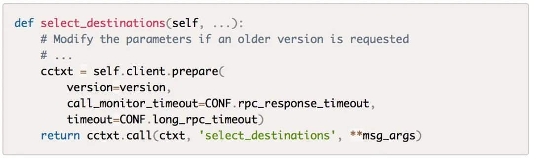 毫无疑问,RPC封装同样是在nova/scheduler的rpcapi.py中实现。该方法RPC调用代码如下: