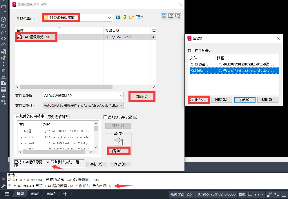 4、通过查找范围找到软件放置的位置,点击加载,点击内容,添加到启动组里面,再关闭窗口。