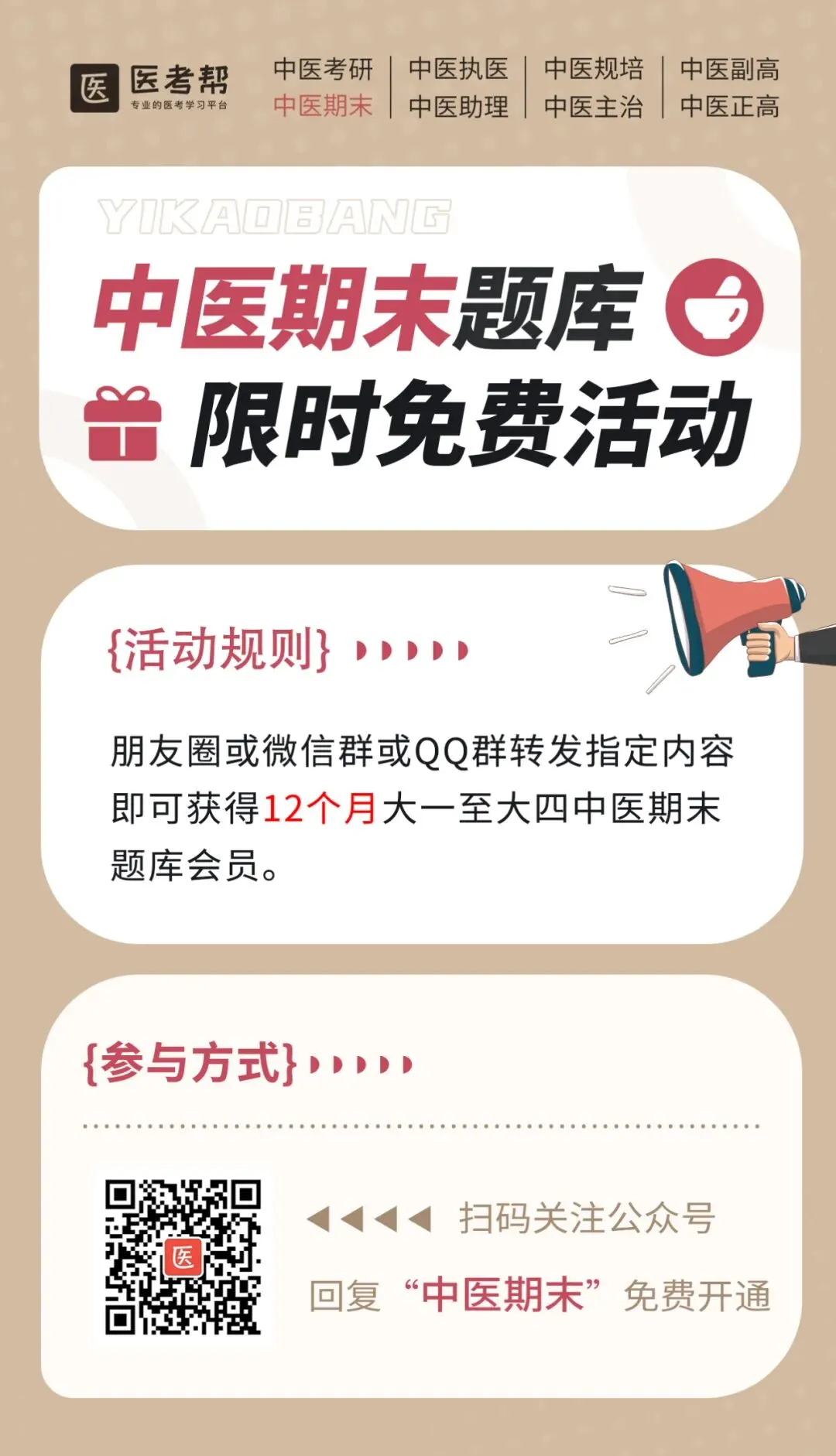 中医期末题库限时免费活动:专为中医专业在校生设计,覆盖大一至大四各年级的期末考试备考需求,直接获得12个月会员权限。