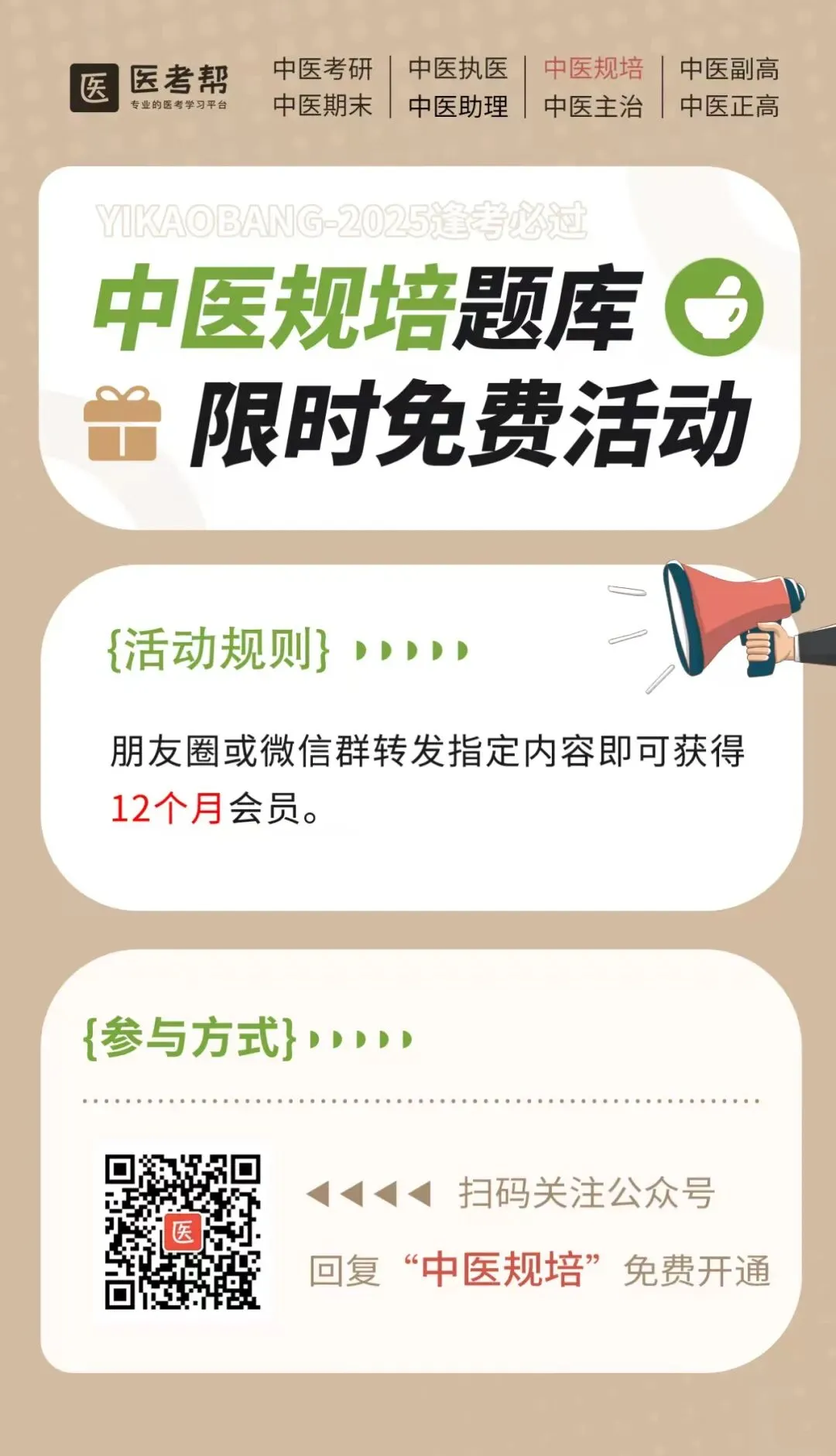 中医规培题库限时免费活动:涵盖中医临床技能、理论知识、病例分析等核心考点,紧扣规培大纲,参与活动可获得 12个月会员权限。