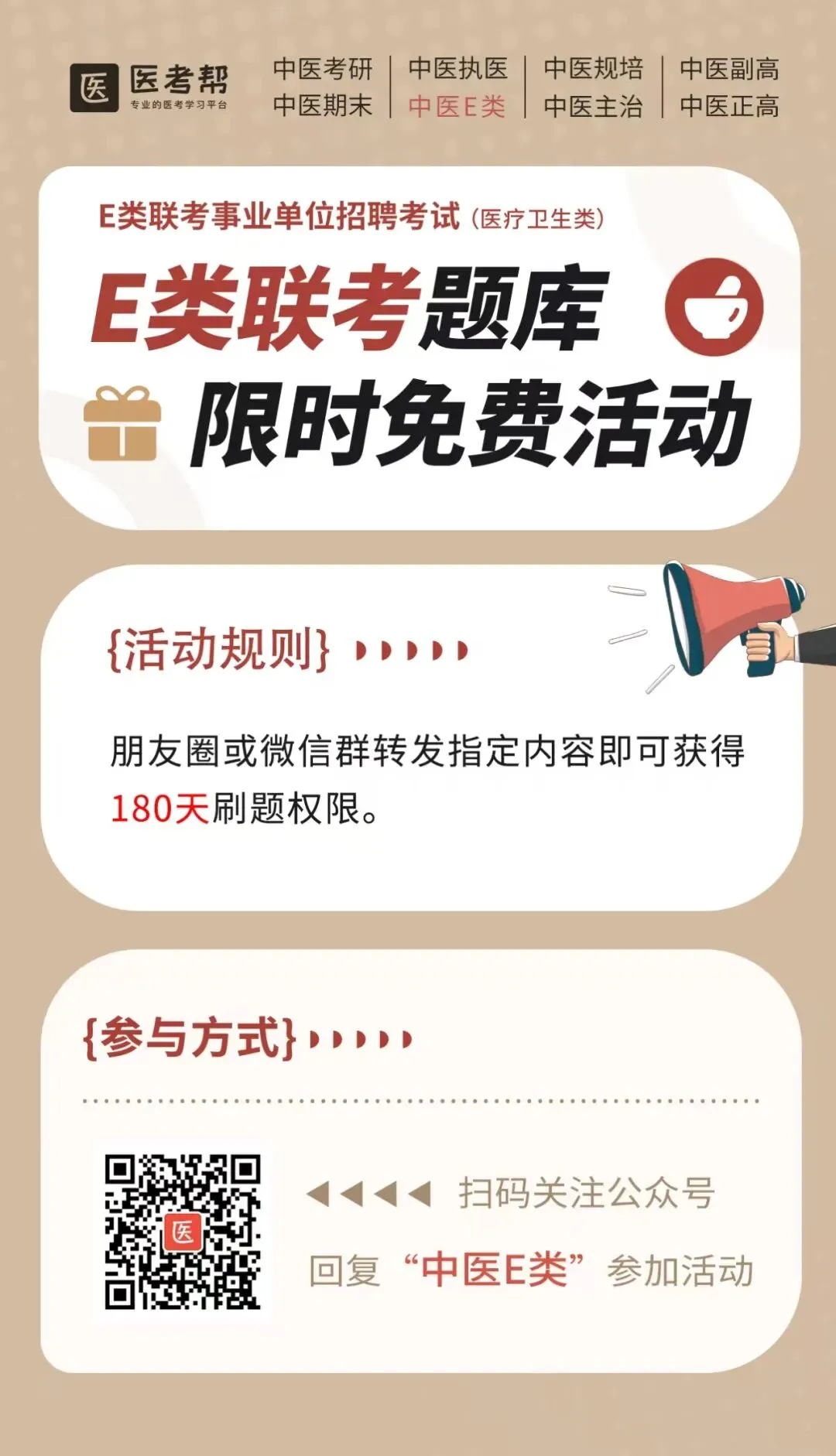中医E类联考题库限时免费活动:包含中医基础、专业知识、医学常识、职业能力测试等模块,全面匹配E类考试要求。参与活动可获得180天刷题权限。