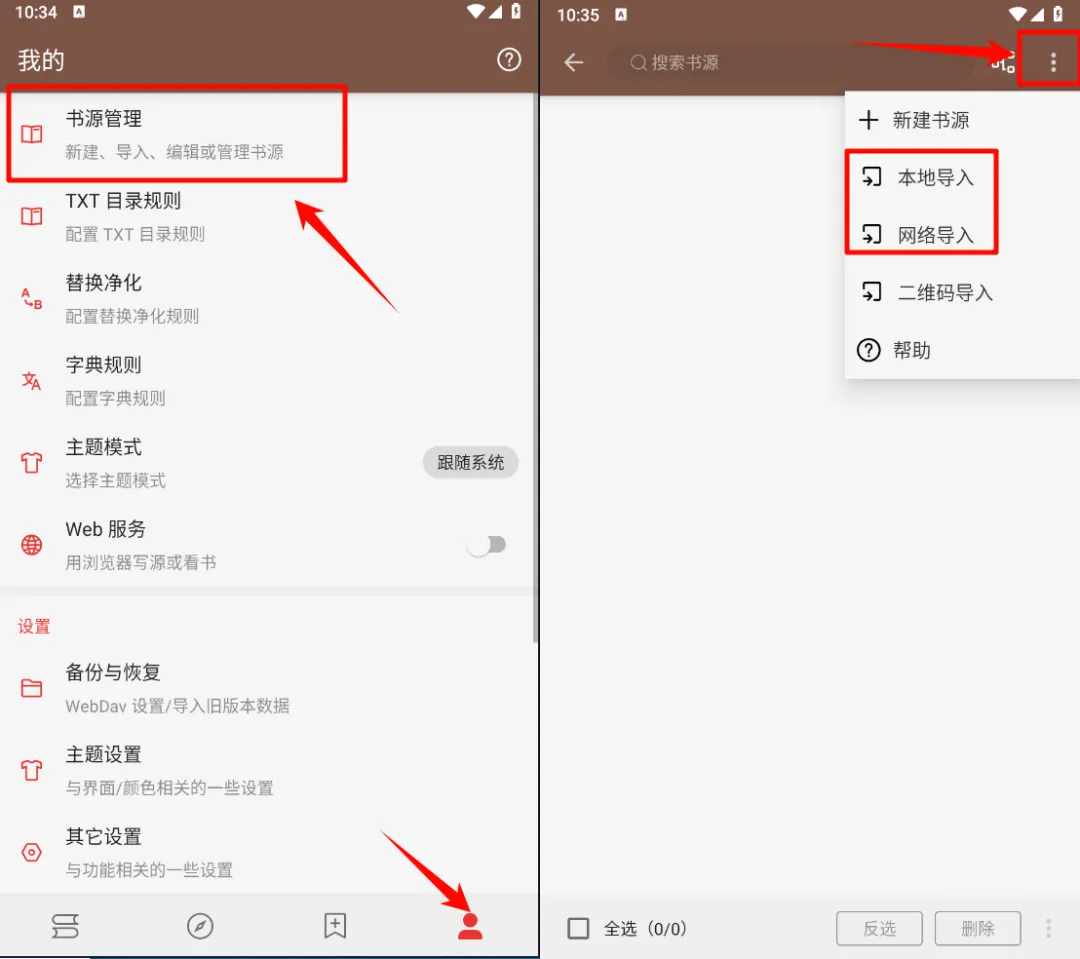 找到【我的】—【书源管理】——【导入书源】,选择本地导入或网络导入