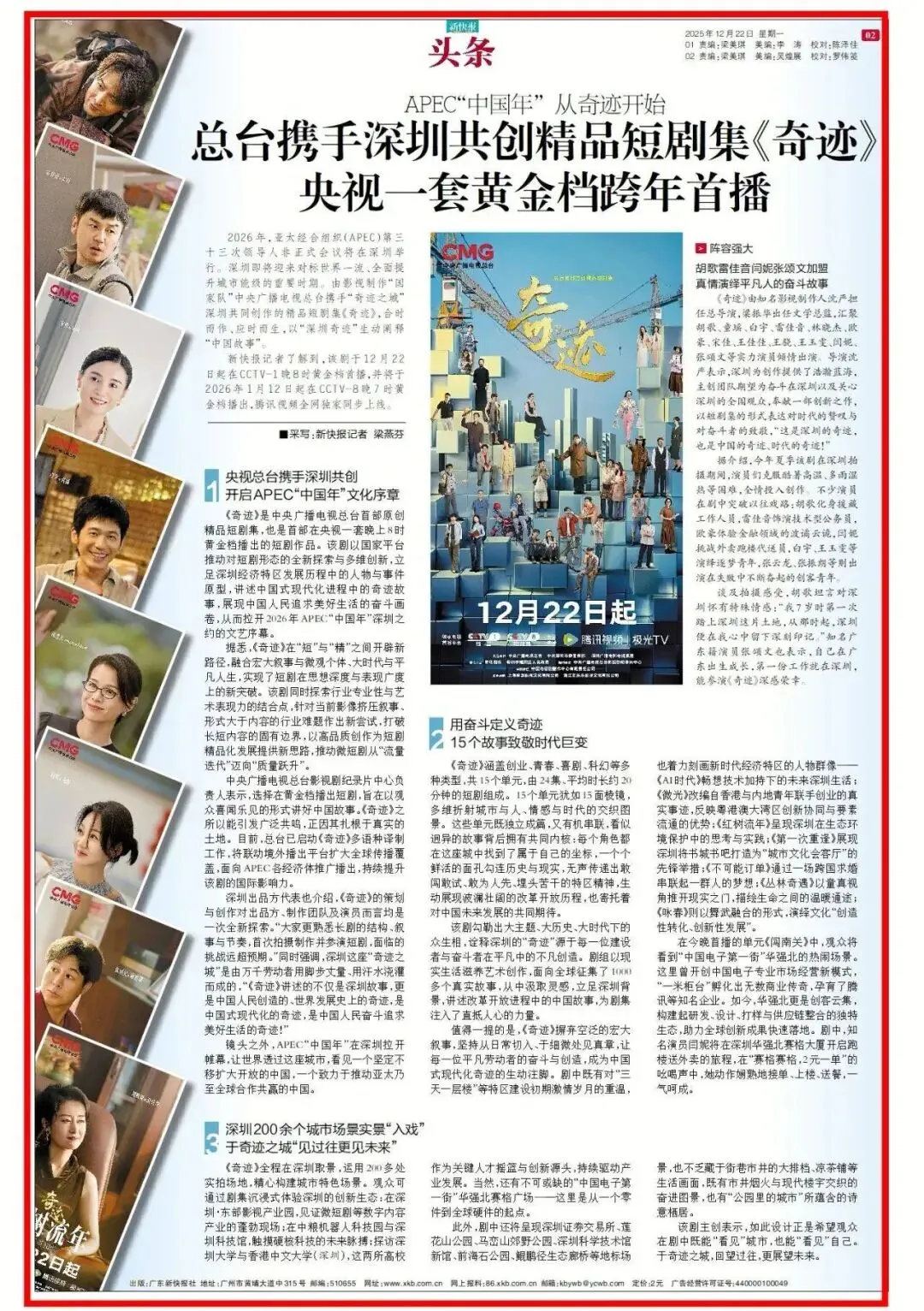 12月22日晚8点,中央广播电视总台与深圳联合打造的精品短剧集《奇迹》,正式登陆CCTV-1晚八点黄金档。这既是总台首部原创精品短剧,也是央视一套黄金档首次迎来短剧集作品。