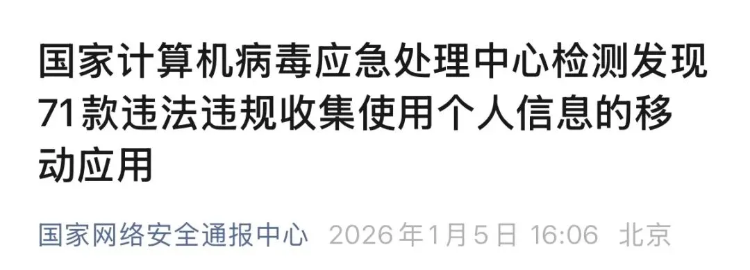 依据《网络安全法》《个人信息保护法》等法律法规,按照《中央网信办、工业和信息化部、公安部、市场监管总局关于开展2025年个人信息保护系列专项行动的公告》要求,经国家计算机病毒应急处理中心检测,71款移动应用存在违法违规收集使用个人信息情况,现通报如下。
