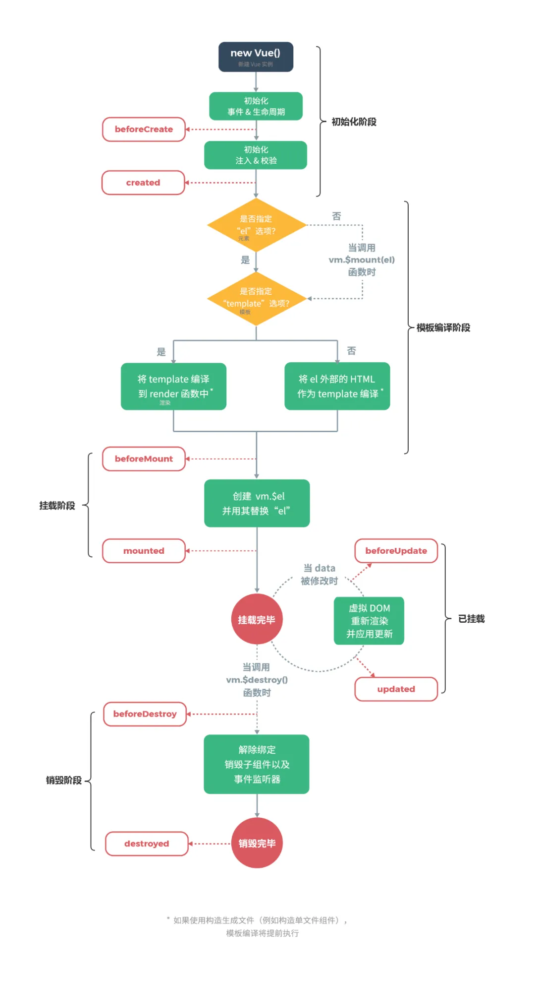 销毁阶段:将实例自身从父组件中删除,并取消依赖追踪及事件监听器;