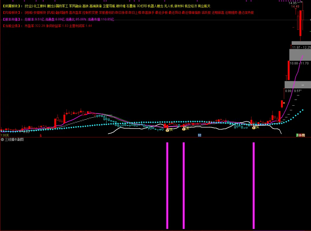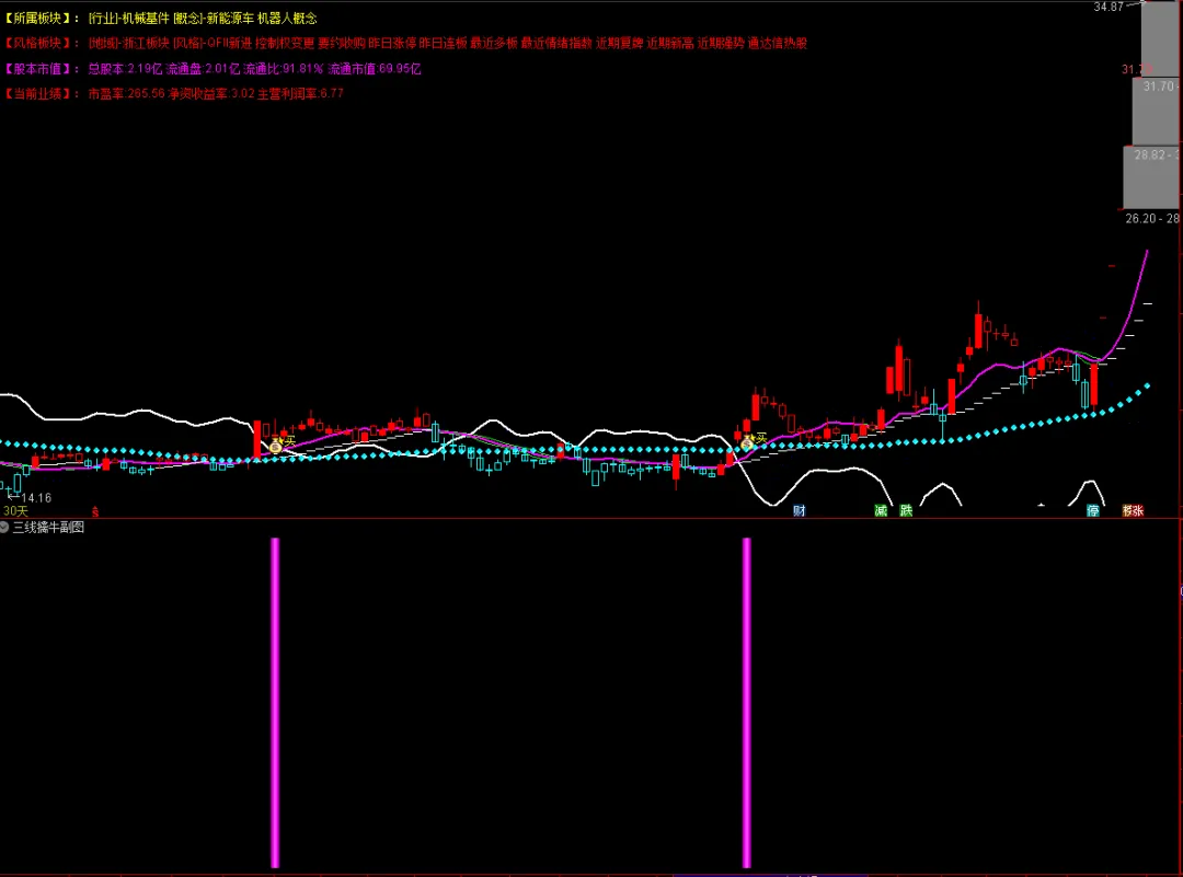 三线擒牛 - (MA3 - 三线擒牛)用点状线表示,反映极短期资金动向(紫色上升,蓝色下降)。