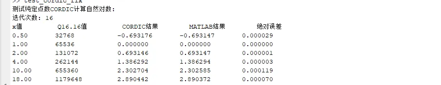 测试结果显示,对于0.5到18的输入范围,定点CORDIC与MATLAB内置log函数的误差极小,验证了算法的正确性。