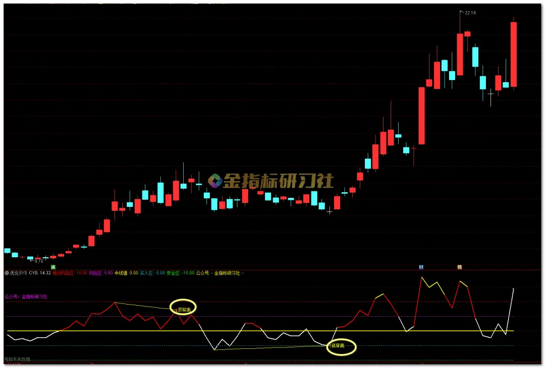 战法二:【背离捉妖战法】(波段反转) 核心心法:股价创新低,但大家的亏损幅度没有创新低,说明主力在暗中护盘吸筹。 具体操作:看副图上的**“↑底背离”**文字信号。当股价还在跌,但 CYS 线不再创新低,且出现黄色连线时,往往是波段大底。 注意:配合成交量缩量,胜率更高。