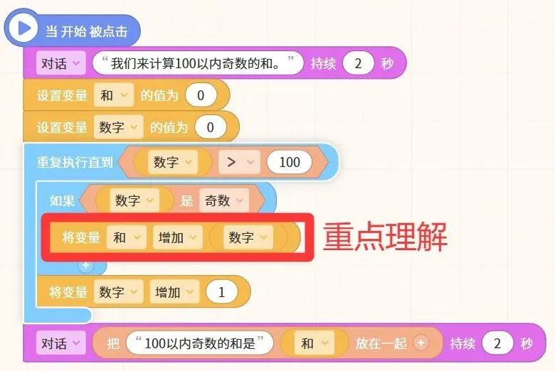 本站文章均为手工撰写未经允许谢绝转载:夜雨聆风 » 图形化编程(源码)计算100以内奇数的和