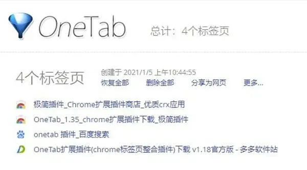 简单来说,OneTab插件主要解决了浏览器标签页占内存、难整理、不便携这几个痛点。