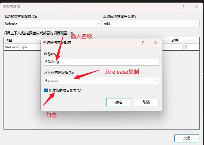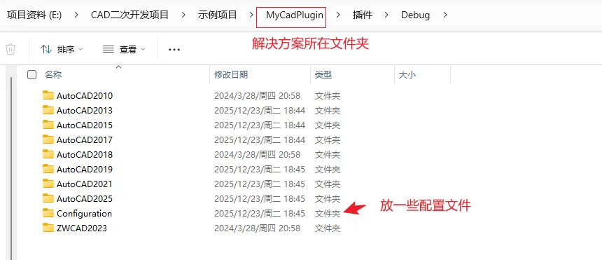 新建文件夹:在解决方案目录下,新建插件文件夹,并且在插件文件夹下增加Debug、RDbug、Release三个文件夹,每一个文件夹下新建不同版本CAD文件夹,以Debug为例