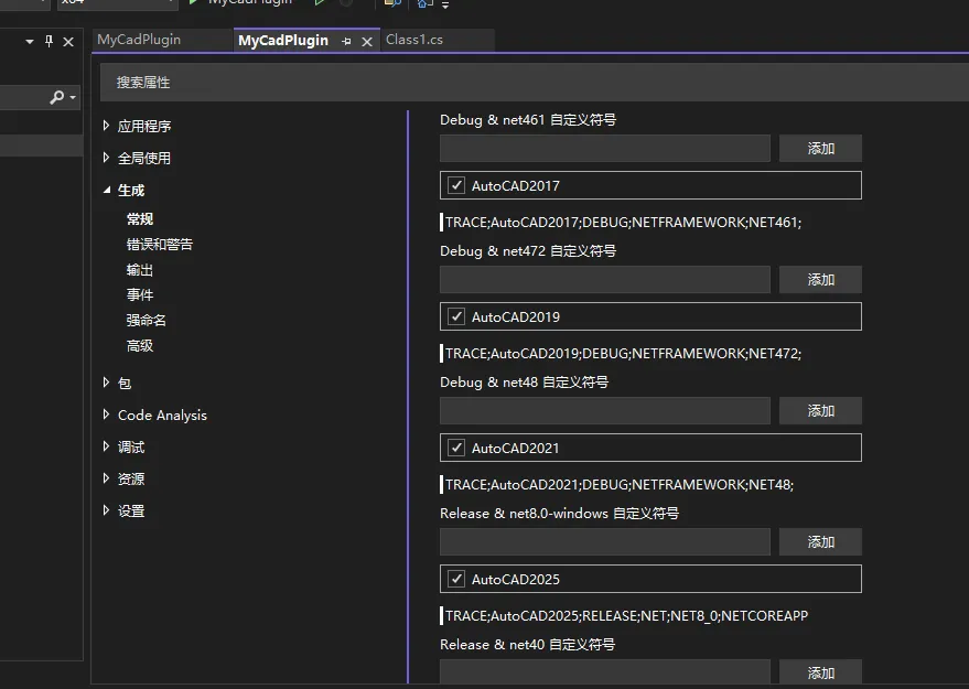 <PropertyGroup Condition="'$(TargetFramework)|$(Platform)'=='net35|x64' And ('$(Configuration)'=='Debug'or'$(Configuration)'=='RDebug'or'$(Configuration)'=='Release')"><DefineConstants>$(DefineConstants);AutoCAD2010</DefineConstants></PropertyGroup><PropertyGroup Condition="'$(TargetFramework)|$(Platform)'=='net40|x64' And ('$(Configuration)'=='Debug'or'$(Configuration)'=='RDebug'or'$(Configuration)'=='Release')"><DefineConstants>$(DefineConstants);AutoCAD2013</DefineConstants></PropertyGroup><PropertyGroup Condition="'$(TargetFramework)|$(Platform)'=='net45|x64' And ('$(Configuration)'=='Debug'or'$(Configuration)'=='RDebug'or'$(Configuration)'=='Release')"><DefineConstants>$(DefineConstants);AutoCAD2015</DefineConstants></PropertyGroup><PropertyGroup Condition="'$(TargetFramework)|$(Platform)'=='net461|x64' And ('$(Configuration)'=='Debug'or'$(Configuration)'=='RDebug'or'$(Configuration)'=='Release')"><DefineConstants>$(DefineConstants);AutoCAD2017</DefineConstants></PropertyGroup><PropertyGroup Condition="'$(TargetFramework)|$(Platform)'=='net472|x64' And ('$(Configuration)'=='Debug'or'$(Configuration)'=='RDebug'or'$(Configuration)'=='Release')"><DefineConstants>$(DefineConstants);AutoCAD2019</DefineConstants></PropertyGroup><PropertyGroup Condition="'$(TargetFramework)|$(Platform)'=='net48|x64' And ('$(Configuration)'=='Debug'or'$(Configuration)'=='RDebug'or'$(Configuration)'=='Release')"><DefineConstants>$(DefineConstants);AutoCAD2021</DefineConstants></PropertyGroup><PropertyGroup Condition="'$(TargetFramework)|$(Platform)'=='net8.0-windows|x64' And ('$(Configuration)'=='Debug'or'$(Configuration)'=='RDebug'or'$(Configuration)'=='Release')"><DefineConstants>$(DefineConstants);AutoCAD2025</DefineConstants></PropertyGroup>
