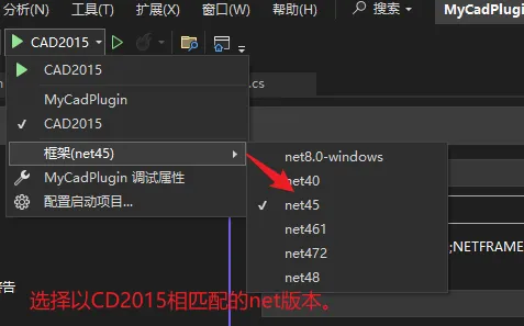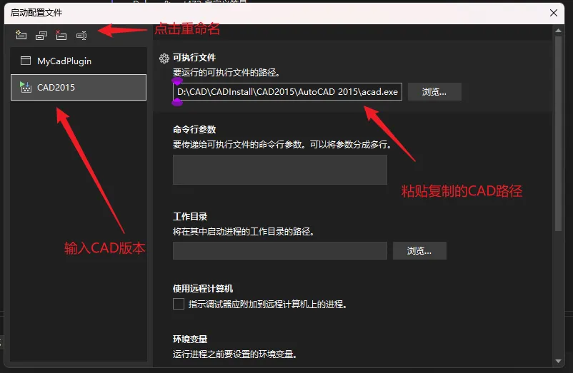 当使用不同版本的CAD进行调试时,需要为不同版本的CAD设置调试属性,以CAD2015为例: