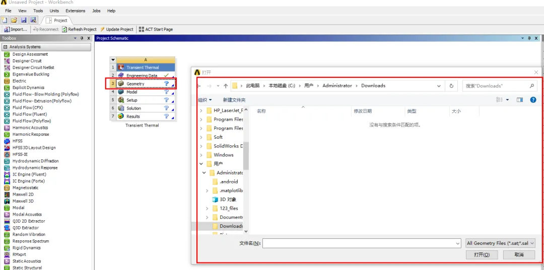 关闭Engineering Data界面,返回ansys主界面,选择【Geometry】,单击鼠标右键,选择【Import Geometry】,点击【Browse】,选择所需要的模型。