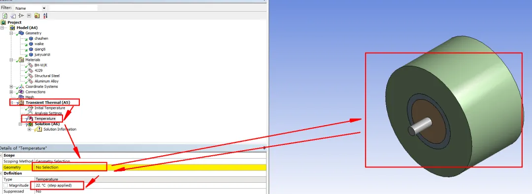选中【Transient Thermal】,单击鼠标右键,选择【Insert】,选择【Temperature】,在三维模型上选择要施加温度的面,然后鼠标点击【Geometry】后的【No Selection】,然后选择Apply,然后输入要施加的温度。
