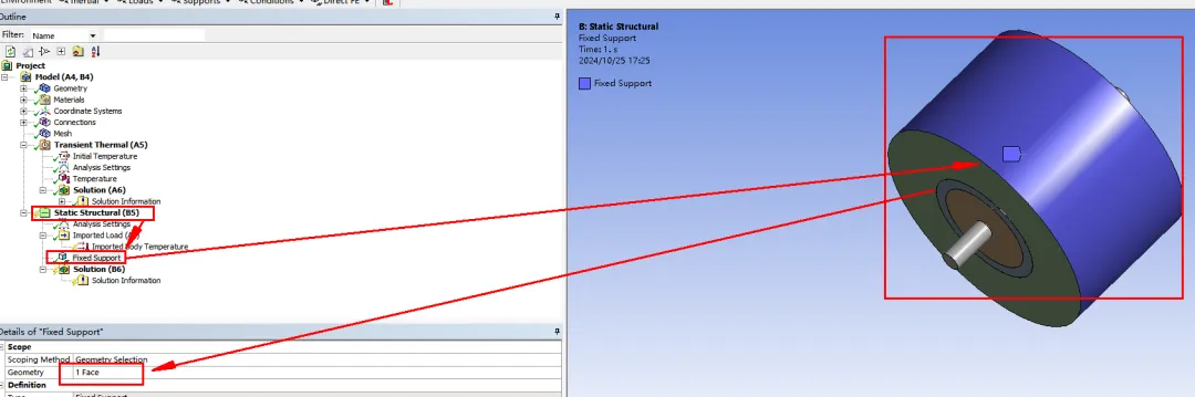 这里选择固定支撑,选中【Static Structural】,单击鼠标右键,选择【Insert】,选择【Fixed Support】。按照添加温度载荷的方法添加选择支撑面。