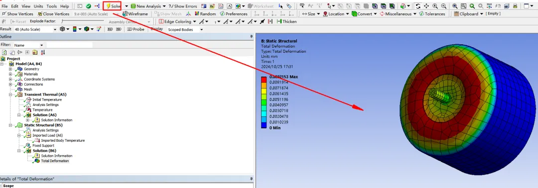 选中【Solution】,单击鼠标右键,选择【Insert】,选择【Deformation】,选择形变量【Total】。然后点击【Solve】,便会出现结果。