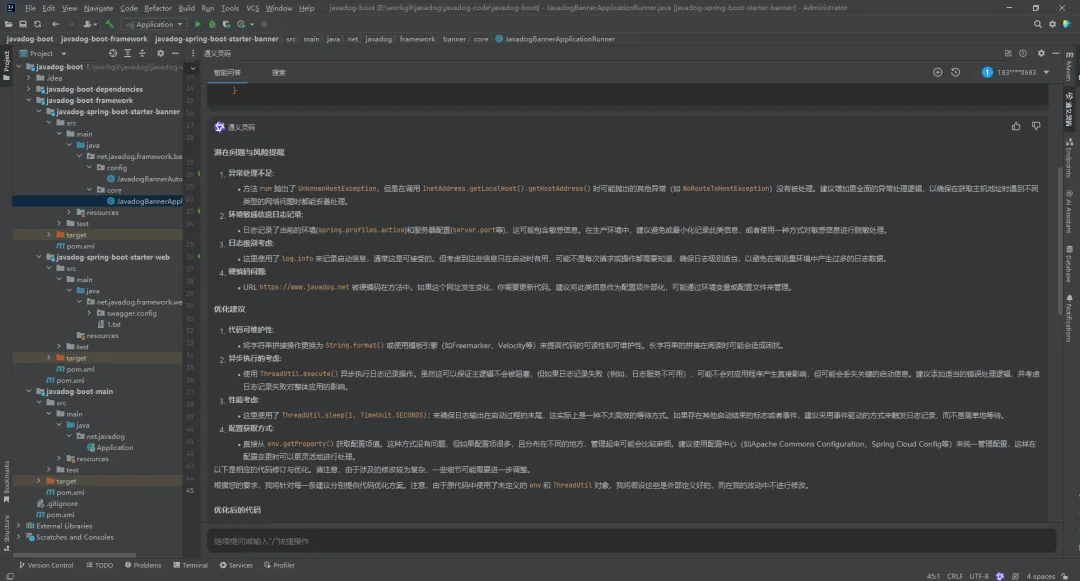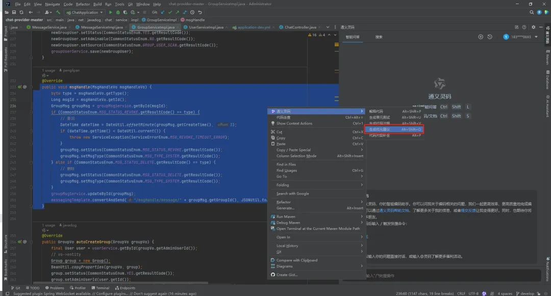 将代码全选,然后【右键】,打开『通义灵码』,选择【生成优化建议】