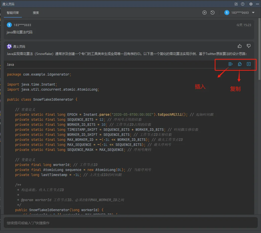 在『通义灵码』控制台,输入java雪花算法代码