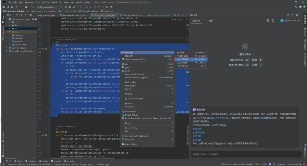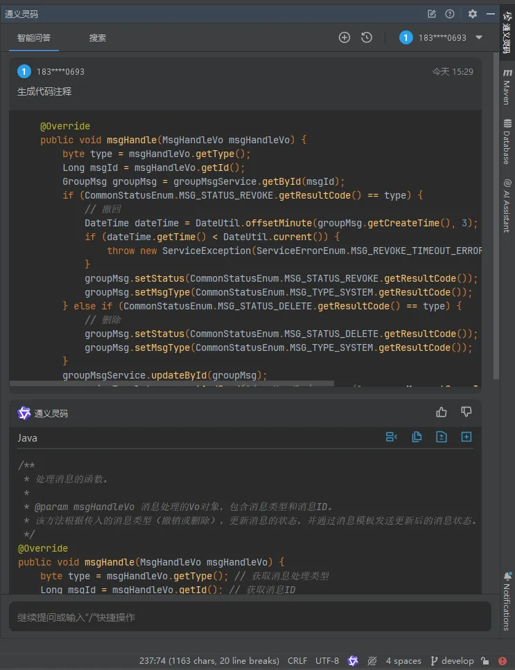 将代码全选,然后【右键】,打开『通义灵码』,选择【生成代码注释】