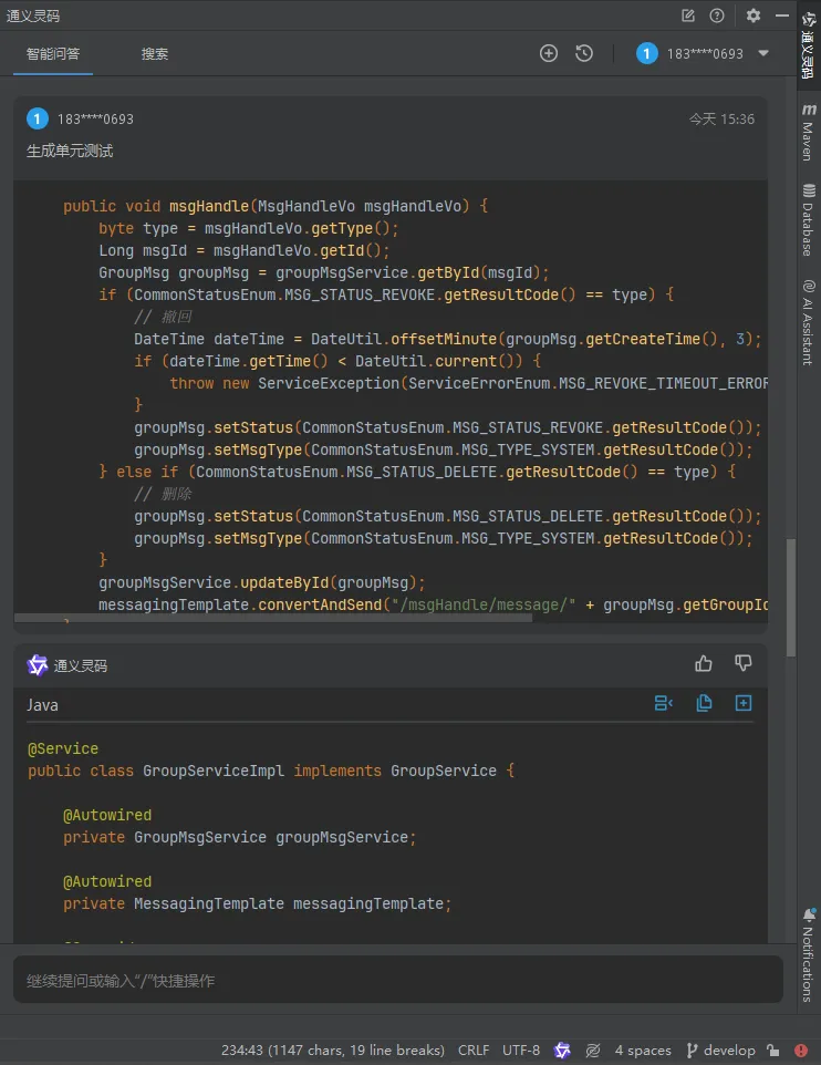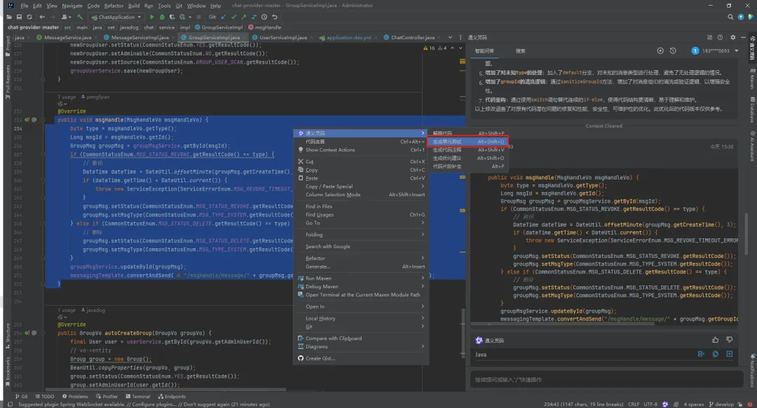 将代码全选,然后【右键】,打开『通义灵码』,选择【生成单元测试】