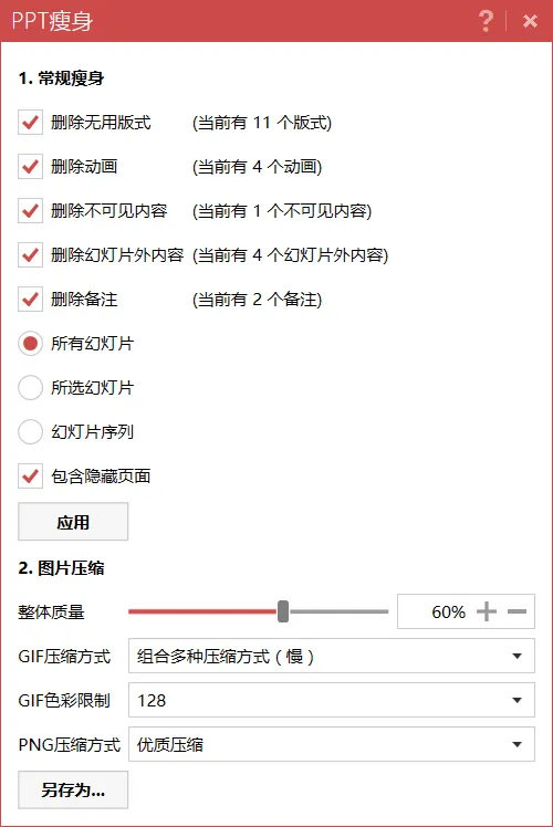 iSlide 的一键瘦身功能,删动画,删备注,压缩图片,让你的 PPT 嗖的一声就瘦了: