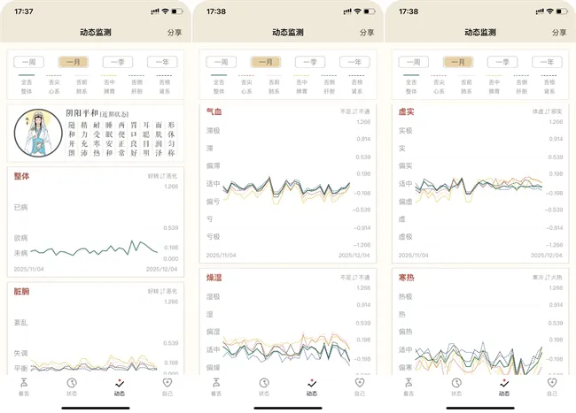 (看舌头APP用户近一个月的气血、燥湿、虚实、寒热动态监测图)
