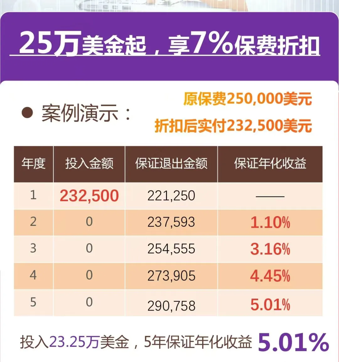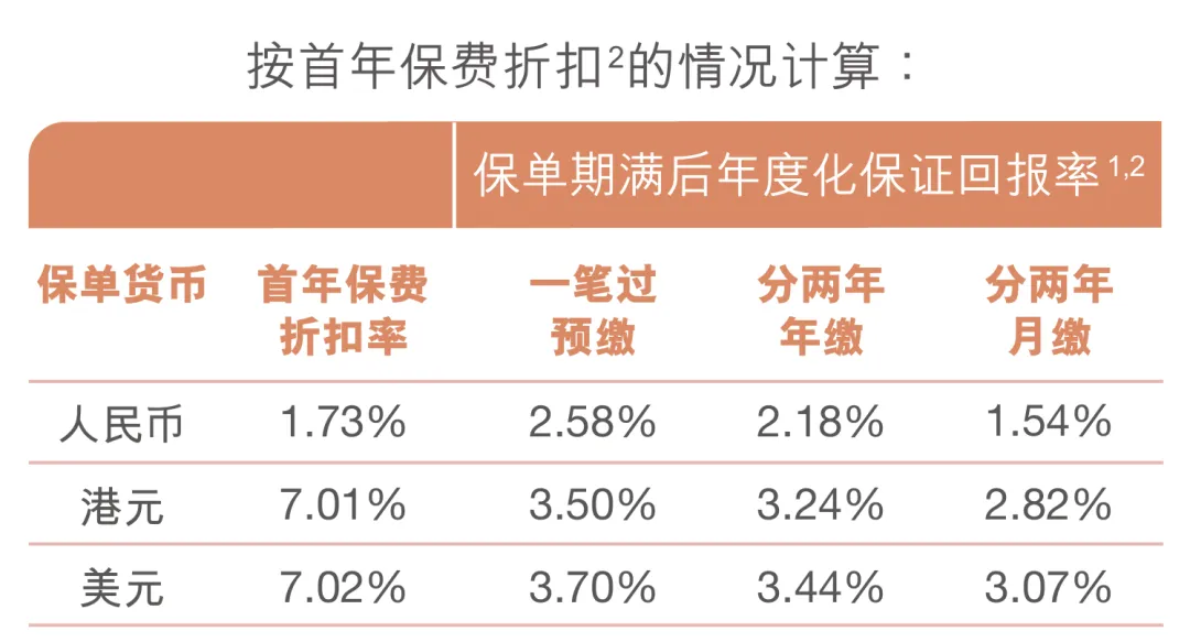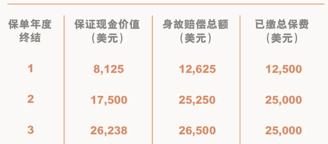 举个例子,30岁的三零先生分两年投入25000美元,算上保费折扣(7.02%),实际只需要支付约24,123美元。持有满3年后退保,能够获得26,238美元,算下来保证回报率能达到3.44%,如果选择一笔过预缴,则保证收益可以达到3.70%。