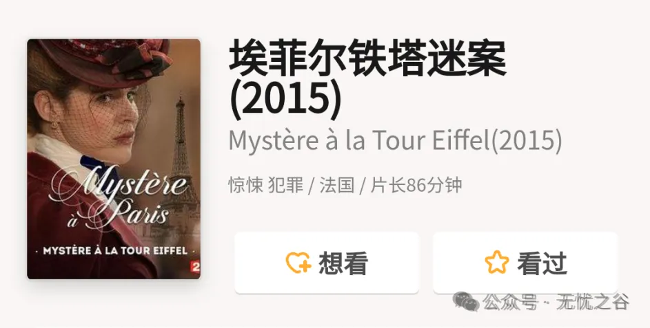 3《埃菲尔铁塔迷案》2015年 法国 犯罪惊悚片。讲述埃菲尔铁塔设计师的女儿发现铁塔上神秘杀人案线索,随即与女友联手展开调查。以巴黎地标埃菲尔铁塔为背景,融合悬疑、犯罪与情感纠葛。