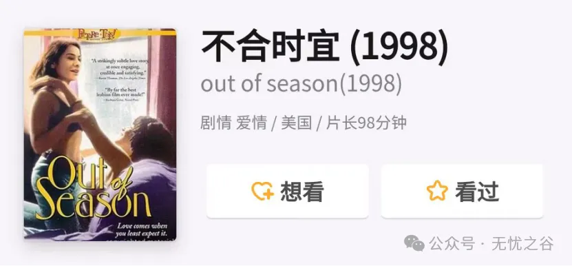 32《不合时宜》,上映于1998年,据说曾被世界上最大最早的女权主义出版社的创始人誉为“史上最好的女同电影”,但现在既查不到这家出版社,更找不到这位创始人,但仍愿曾有这段往事。一段互相没有预期却走到一起的爱情,如果别人的爱情是择一城终老,那她们的爱情是“一直在路上”,这个路不是未到达,而是一起驾车走遍美国。