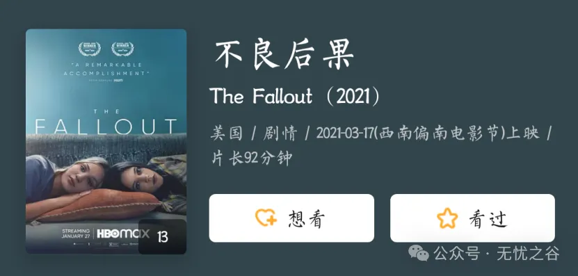 33《不良后果》2021年上映的美国电影。以校园枪击案为背景,展现了这一悲剧下高中生瓦达和米娅的迷茫恐惧。米娅父母是艺术家经常出差,刚好这个悲剧发生时父母不在身边,留米娅一人在家,瓦达和米娅在米娅家选择酒精和大麻对抗恐惧和迷茫,劫后余生的两人,天时地利具备的条件刚好走在了一起。两人敷面膜泳池嬉闹,岸边卷烟,精神恍惚中街上共舞情节等桥段,印象深刻。