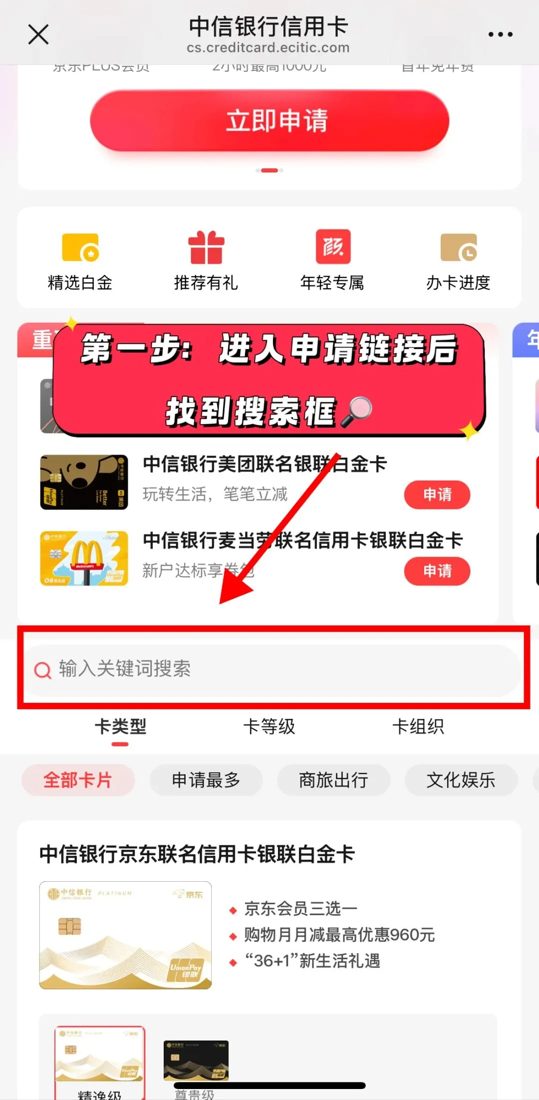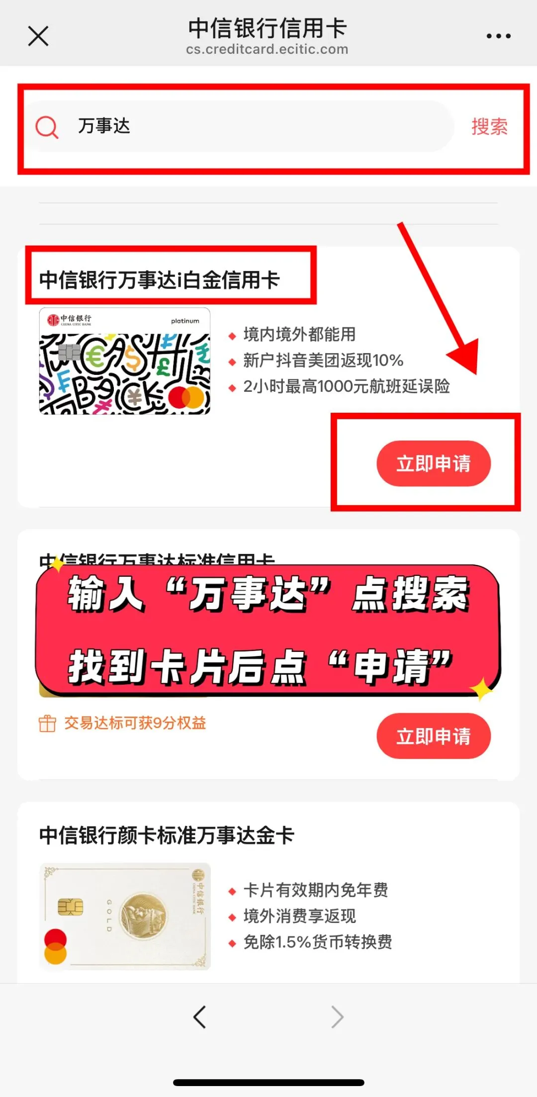 第一步:进入申请链接搜“万事达”选对卡片进行申请