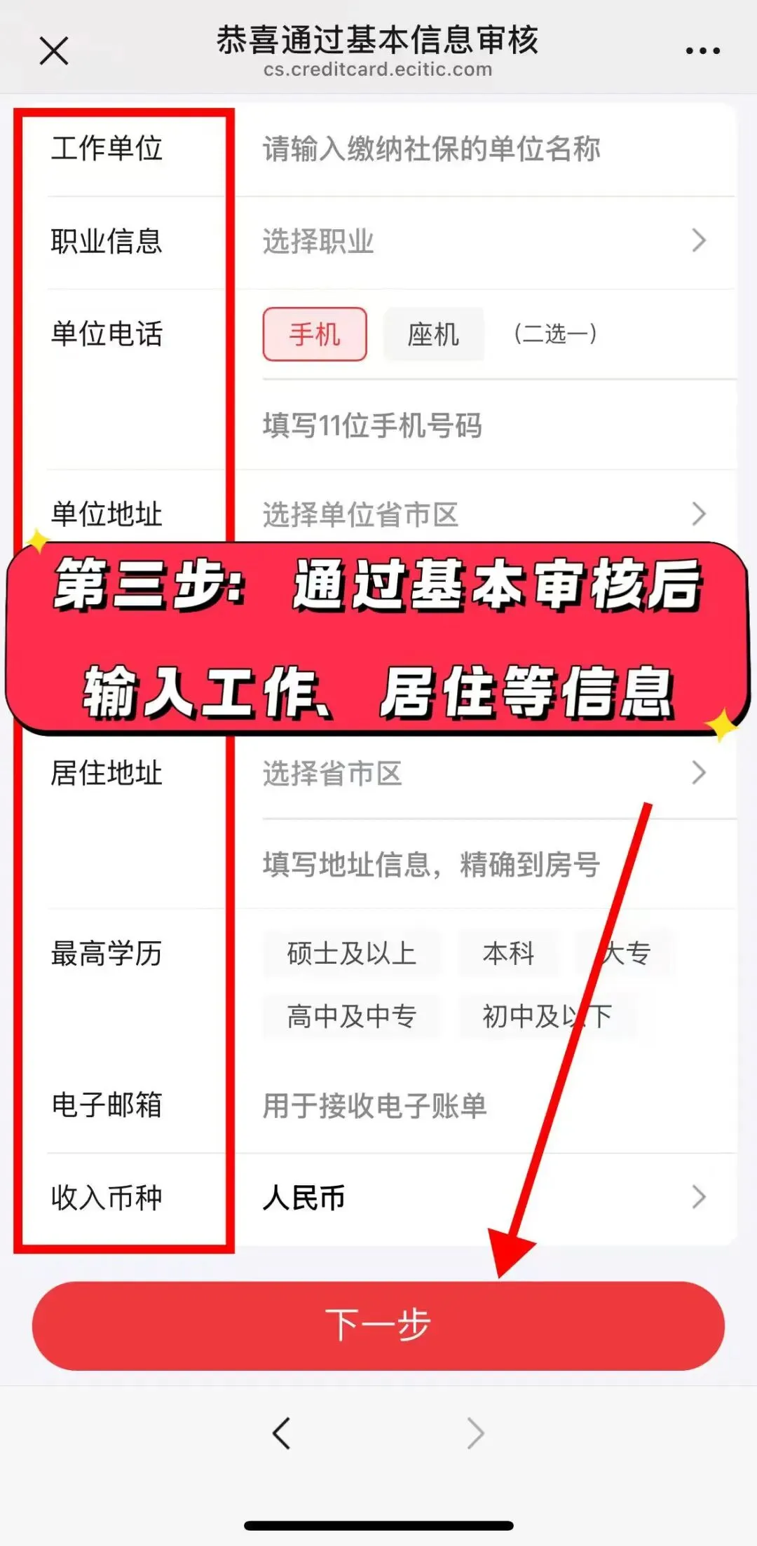 第三步:输入工作、居住等信息提交