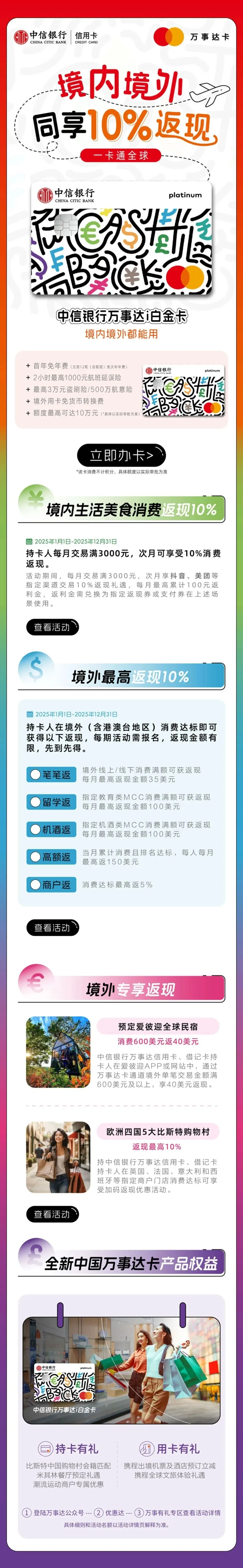 境外:境外用卡免1.5%货币转换费 ,境外消费最高返现10%。