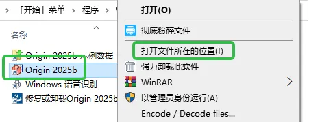 18、选择【Origin 2025b】,鼠标右键点击打开文件所在的位置进去安装目录位置。