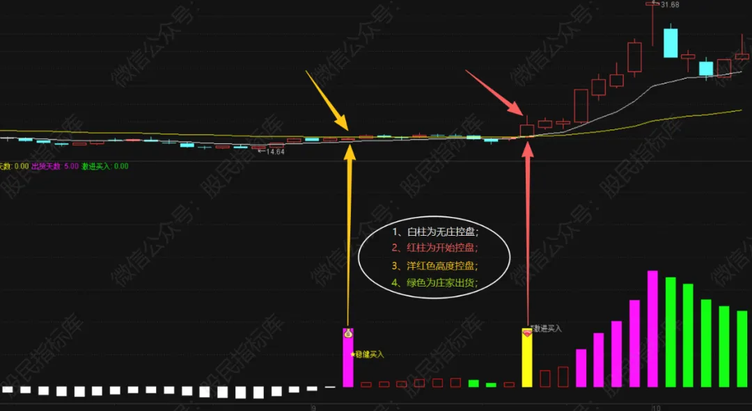 1、通过控盘值监测主力状态,识别”无庄、有庄、出货和高度控盘”阶段,并以颜色直观区分。