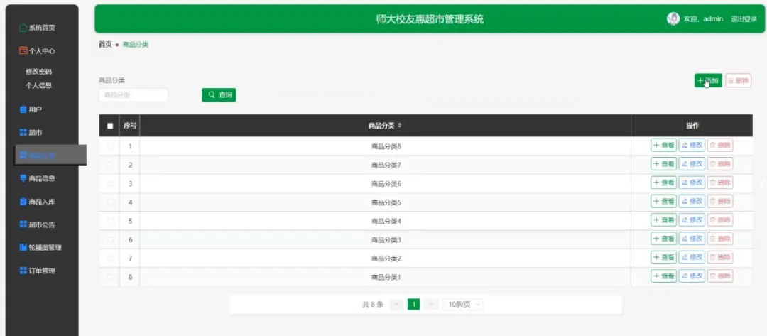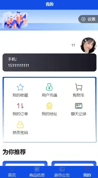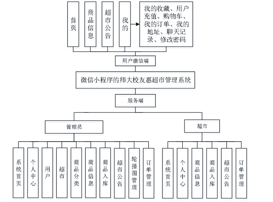 商品信息、收藏、超市、购物车、商品入库、地址、商品分类、订单、好友、商品信息评论、充值记录、消息、超市公告
