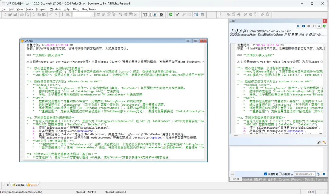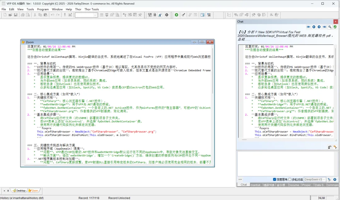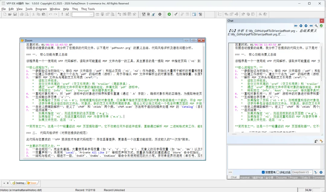 VFP AI 插件:"上传"文本、PDF、DOCX格式文件 文本格式文件: PDF格式文件: DOCX格式文件: 作为 AI 插件,怎么能略过多种文档格式的文件作为附件呢? 本插件截止目前,已支持下列格式:txt、csv、prg、htm、html、md、pdf、doc、docx格式。 如需其他格式支持,在AI插件良好的架构下,轻而易举。 如果你喜欢,可以回复/私信/私聊有偿获取。